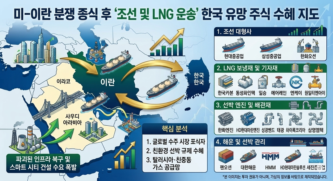 미-이란 분쟁 종식 후 '조선 및 LNG 운송' 한국 유망 주식 TOP 20 분석 서론: 호르무즈 해협의 개방과 에너지 공급망의 대전환2026년 초, 세계 최대의 에너지 동맥인 호르무즈 해협을 둘러싼 미-이란 간의 군사적 긴장이 해소되면서 글로벌 해운 및 에너지 시장이 새로운 국면을 맞이하고 있습니다. 전쟁 기간 동안 억눌렸던 중동발 원유 및 LNG(액화천연가스) 물동량이 정상화됨은 물론, 에너지 안보를 강화하려는 유럽과 아시아 국가들의 '탈 러시아·친중동' 가스 공급망 다변화 전략이 가속화되고 있습니다.특히 한국 조선업계는 세계 최고 수준의 LNG 운반선 건조 기술력을 바탕으로 전후 에너지 수송 수요 폭발의 최대 수혜지로 부상했습니다. 안정적인 가스 공급을 위한 신규 발주와 노후 선박 교체 수요가 맞물..