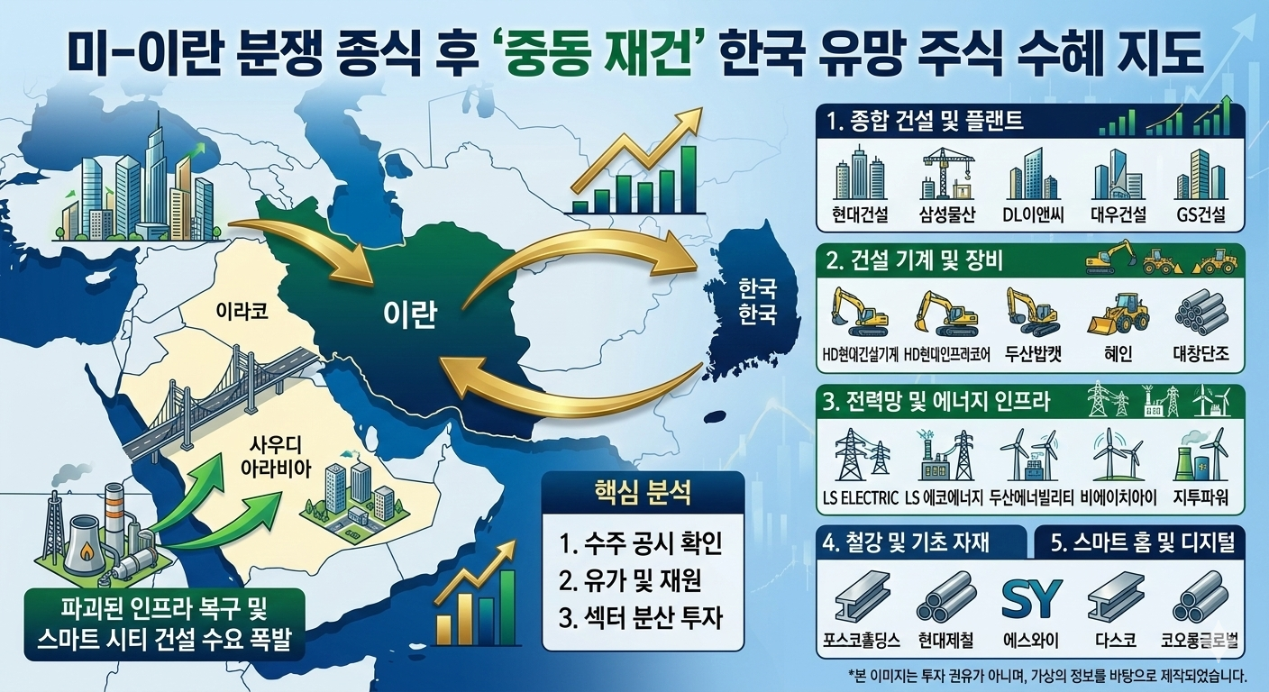 미-이란 분쟁 종식 후 '중동 재건' 수혜 한국 유망 주식 TOP 20 분석서론: 전쟁의 포화가 걷히고 열리는 '재건의 시간'2026년 초, 전 세계 경제를 위협하던 미-이란 간의 긴장이 완화되고 종전 논의가 급물살을 타면서 금융 시장의 시선은 이제 파괴된 인프라의 복구로 향하고 있습니다. 중동 지역은 전통적으로 한국 건설사와 제조 기업들의 '텃밭'과 다름없으며, 이번 분쟁 종식은 단순한 리스크 해소를 넘어 거대한 재건 특수를 예고하고 있습니다.특히 이번 재건은 단순한 건물 복구를 넘어 에너지 안보와 디지털 인프라가 결합된 스마트 재건의 양상을 띨 것으로 보입니다. 투자자들이 반드시 주목해야 할 분야별 유망 종목 20개를 선정하여 상세히 분석합니다.1. 종합 건설 및 플랜트: 재건 사업의 컨트롤 타워 (..