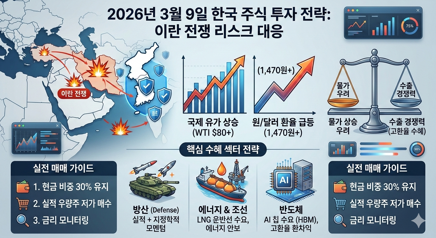 2026년 3월 9일 국장 투자 전략: 전쟁 리스크 속 '위기'를 '기회'로1. 현재 시장 상황 분석: 유가와 환율의 더블 쇼크지난 2월 28일 미국과 이스라엘의 전격적인 공습 이후, 이란이 호르무즈 해협 봉쇄를 선언하면서 국제유가(WTI)는 단숨에 배럴당 80달러 중반을 넘어섰습니다. 이는 한국 경제의 아킬레스건인 '수입 물가 상승'과 '경상수지 악화'를 자극하고 있습니다.환율 변동성: 원/달러 환율이 1,470원~1,500원선을 위협하며 외국인 수급에 부담을 주고 있습니다.스태그플레이션 우려: 고유가가 물가를 자극해 한은의 금리 인하 시점이 늦춰질 수 있다는 공포가 확산 중입니다.심리적 지지선: 코스피(KOSPI)는 단기 충격으로 조정을 받고 있으나, 실적이 뒷받침되는 '반도체'와 '방산'이 지수를 ..